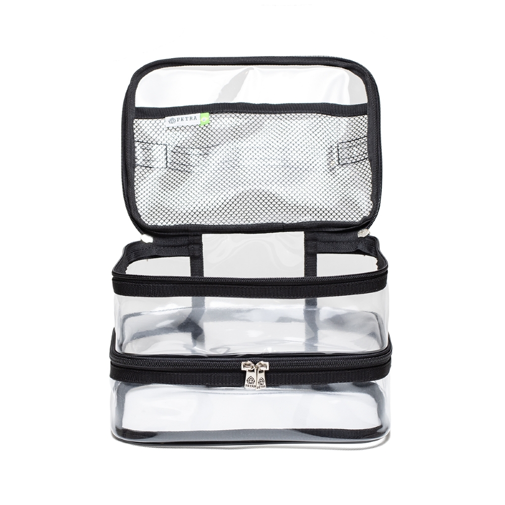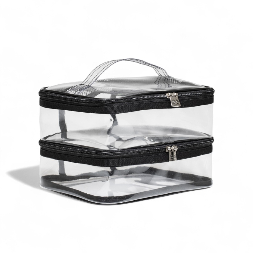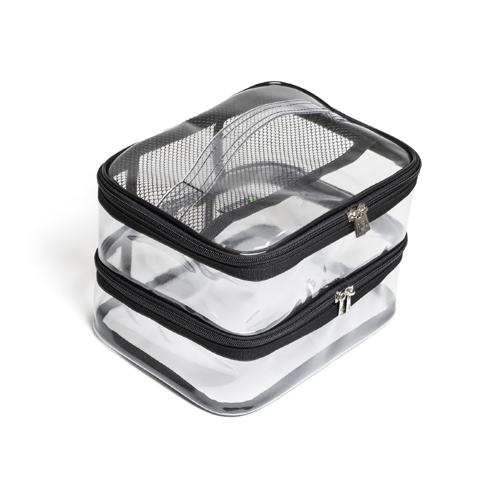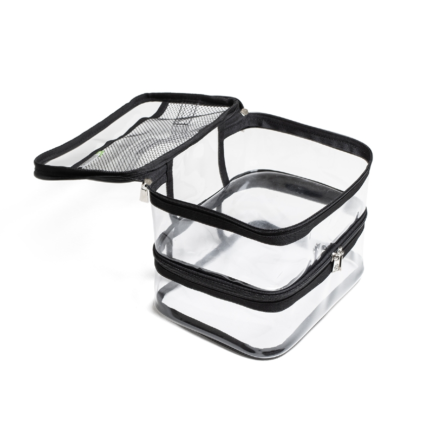 Possui tamanho médio e divisão transparente em dois andares, tampa com compartimento em tela, oferecendo a organização ideal para os seus itens pessoais.