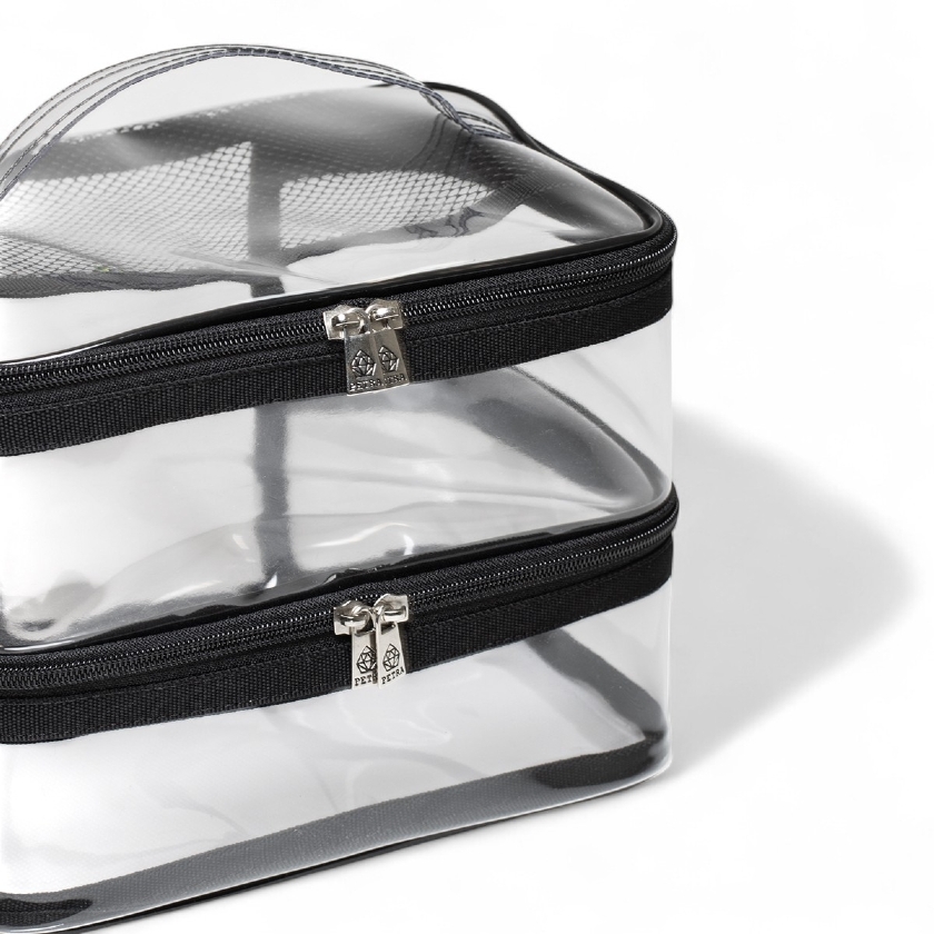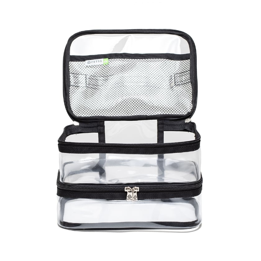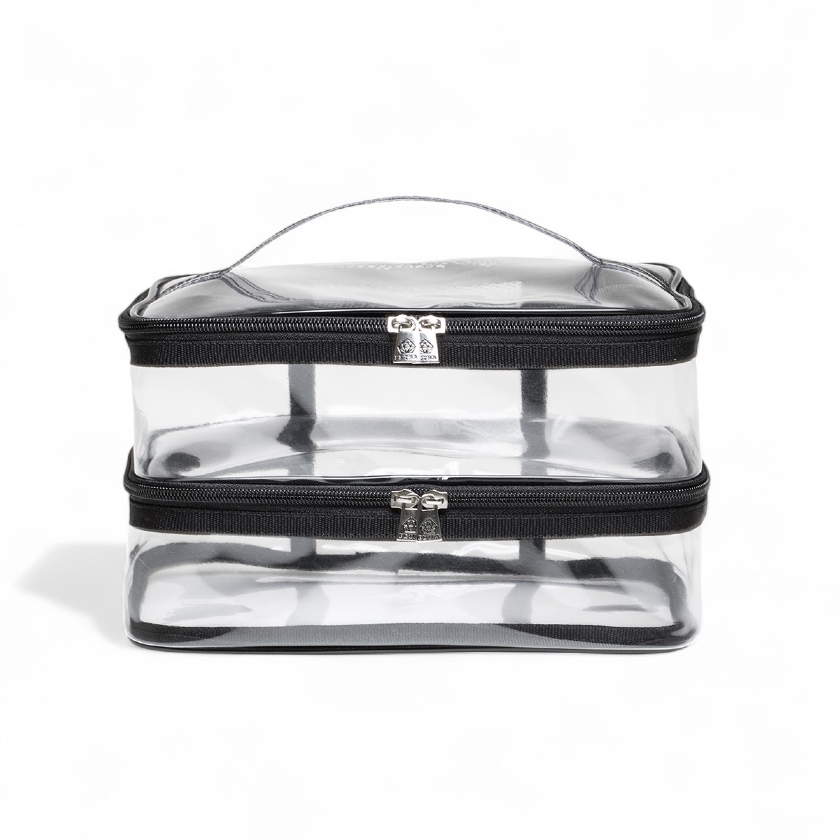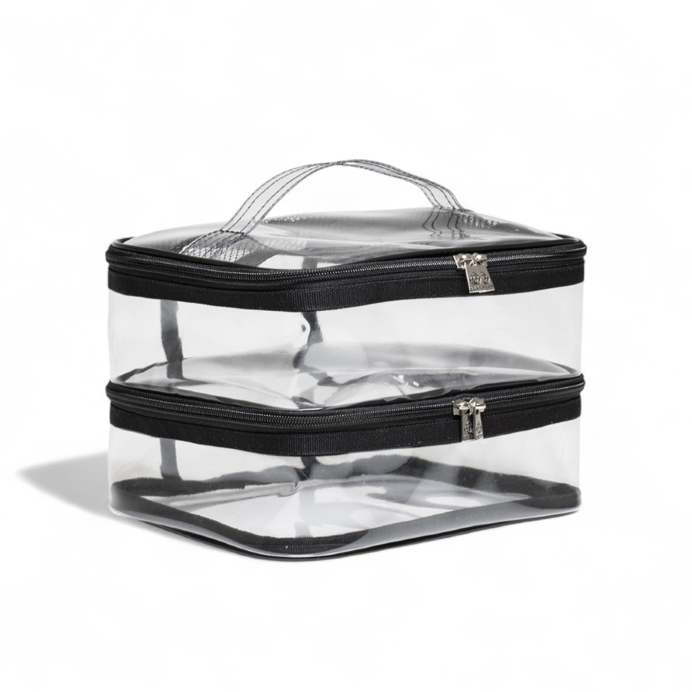 Possui tamanho médio e divisão transparente em dois andares, tampa com compartimento em tela, oferecendo a organização ideal para os seus itens pessoais.