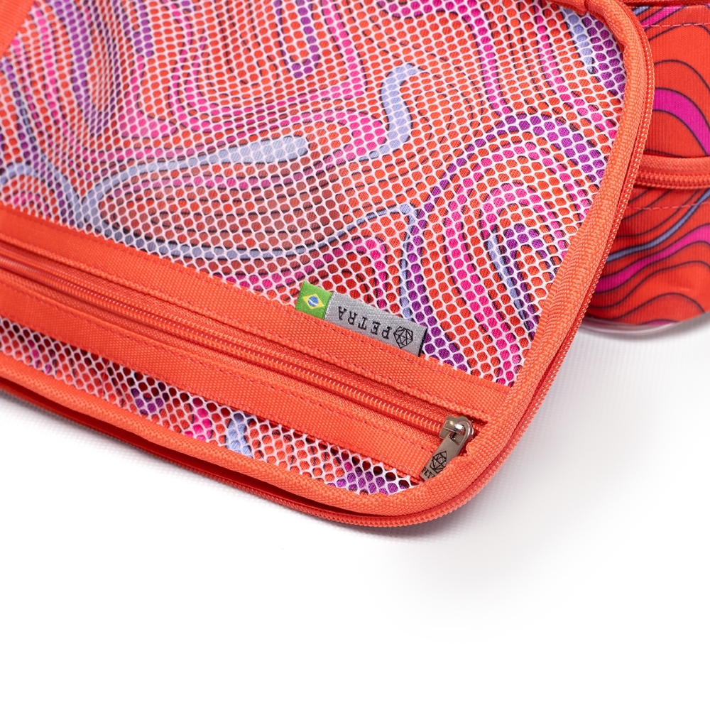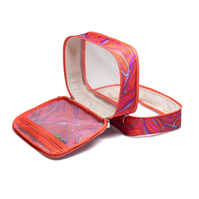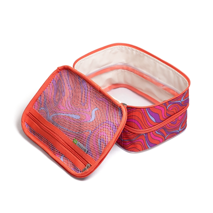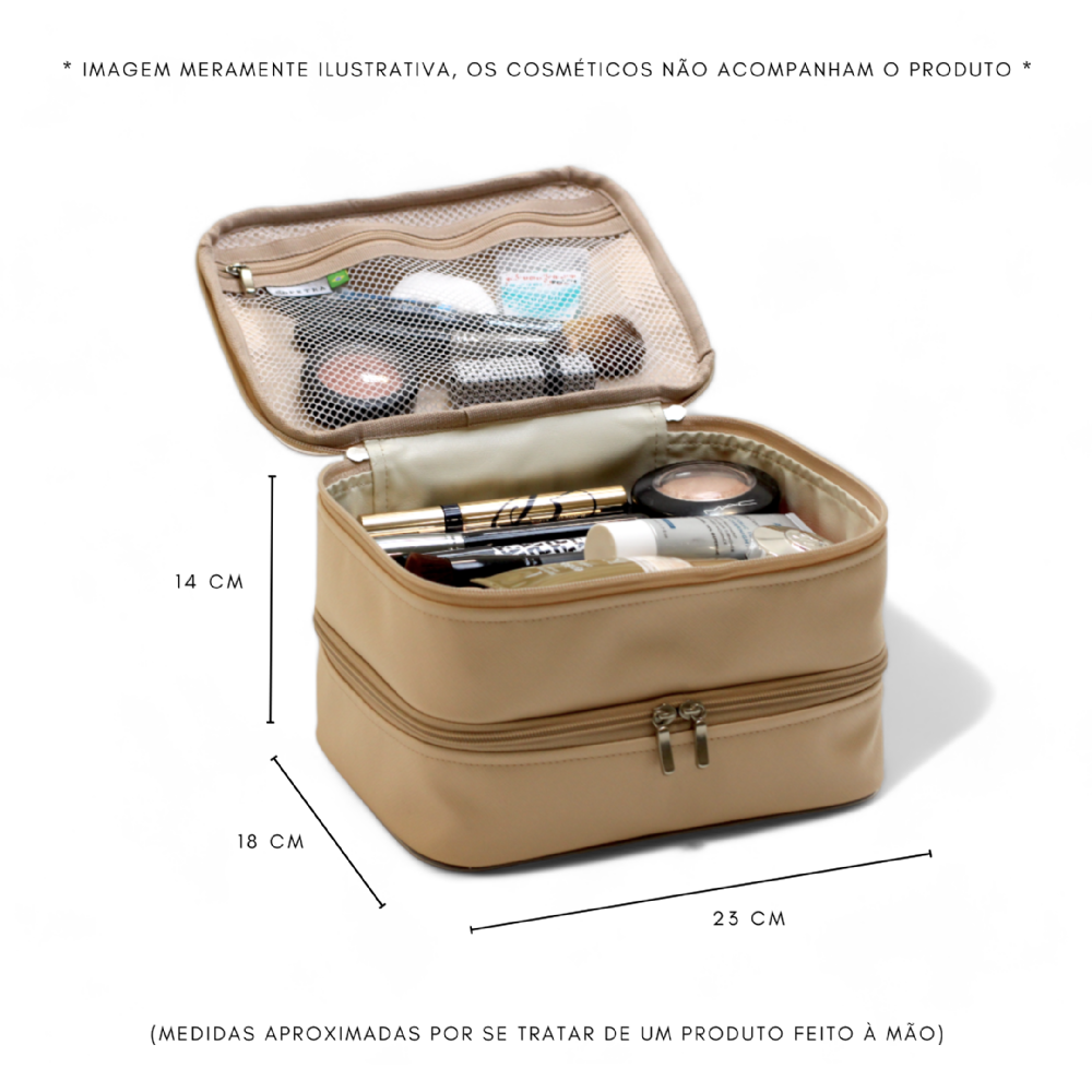 Possui tamanho médio e divisão transparente em dois andares, tampa com compartimento em tela, oferecendo a organização ideal para os seus itens pessoais.