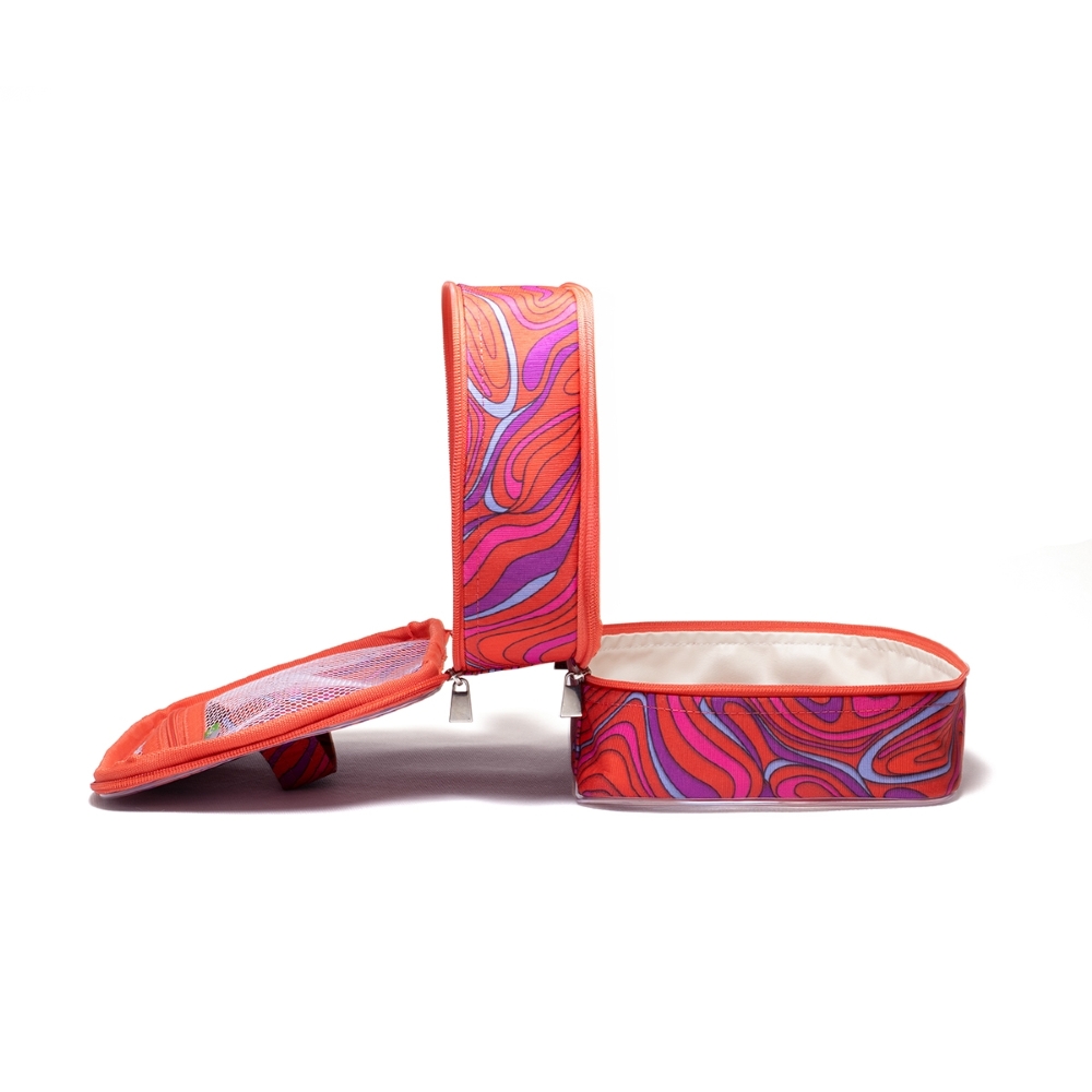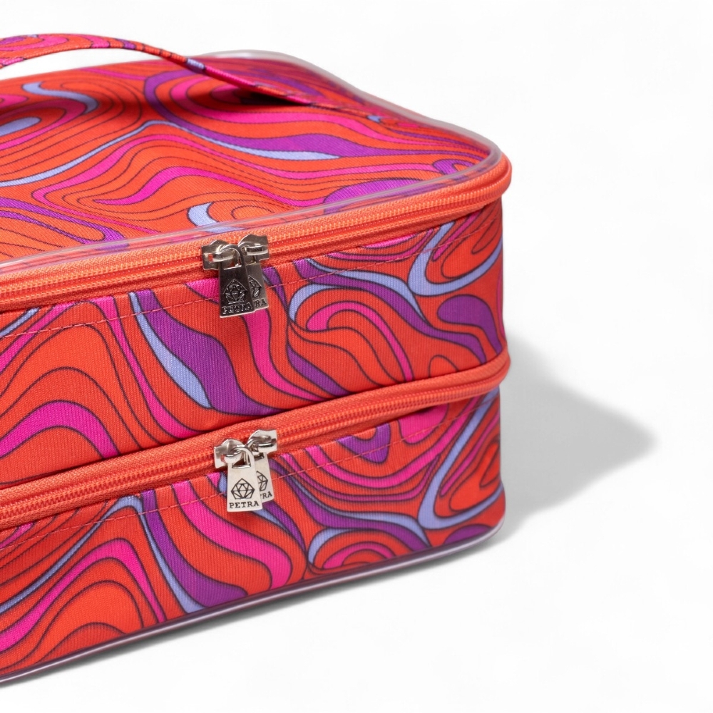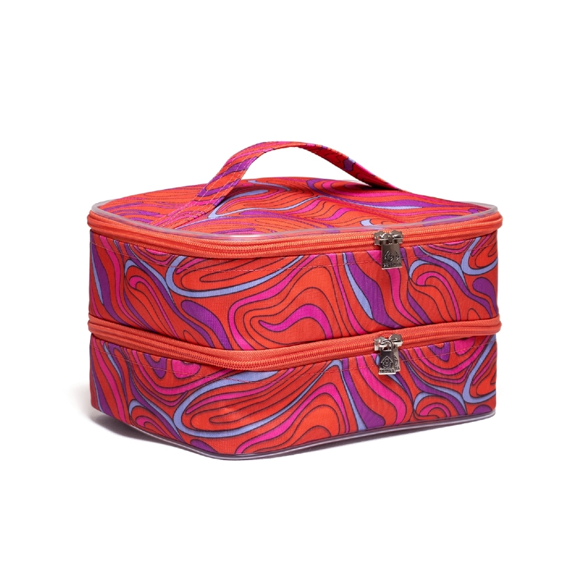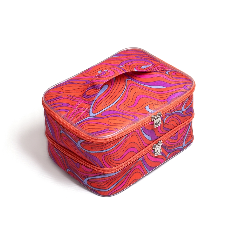Possui tamanho médio e divisão transparente em dois andares, tampa com compartimento em tela, oferecendo a organização ideal para os seus itens pessoais.