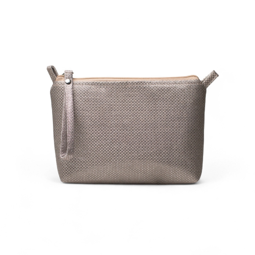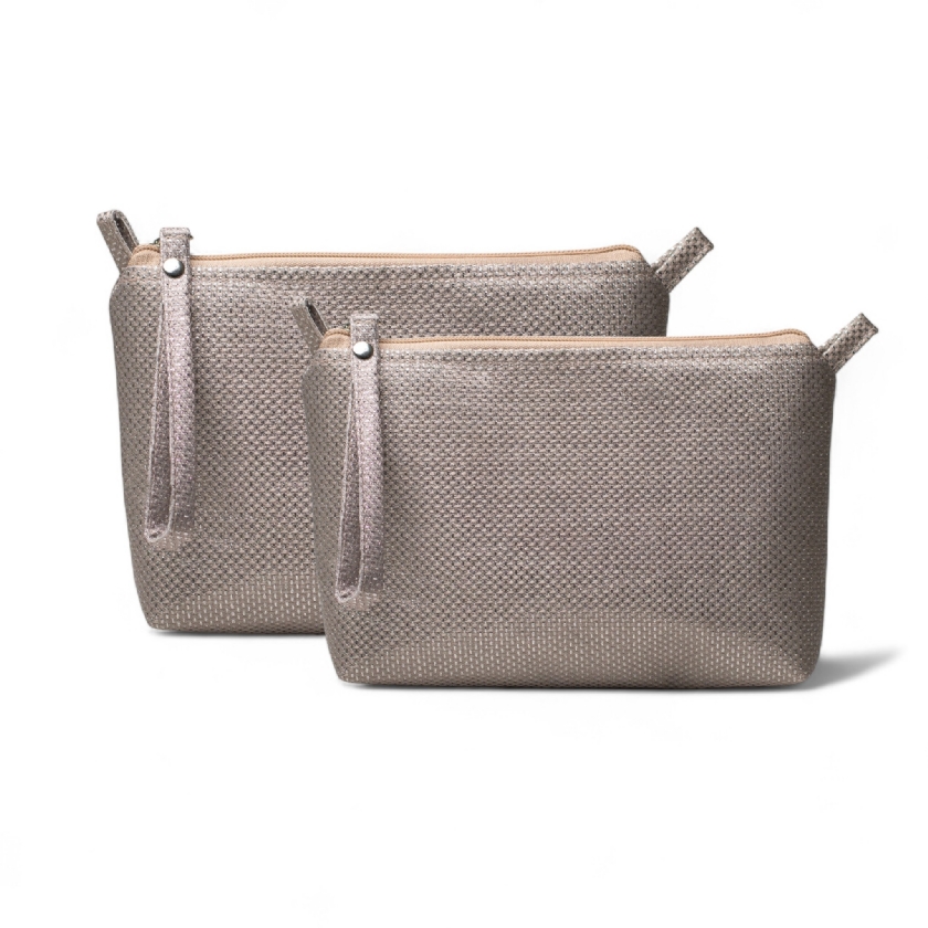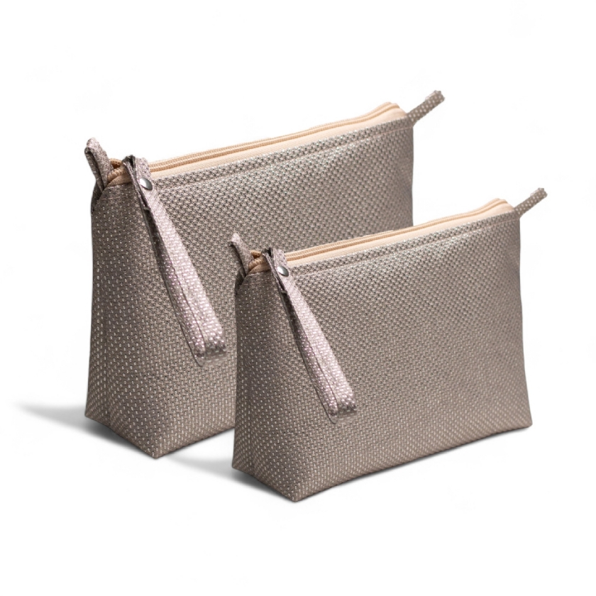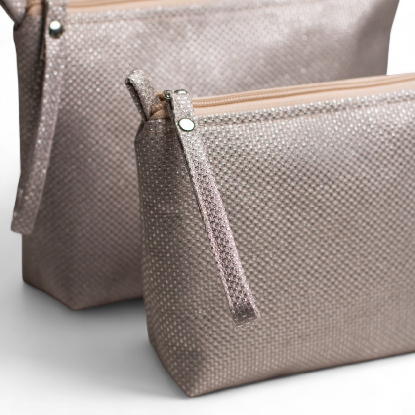 As Necessaires Brilhante, na cor Bege Lurex, formam um combo funcional.