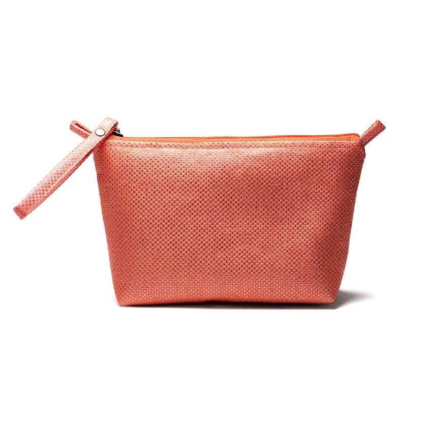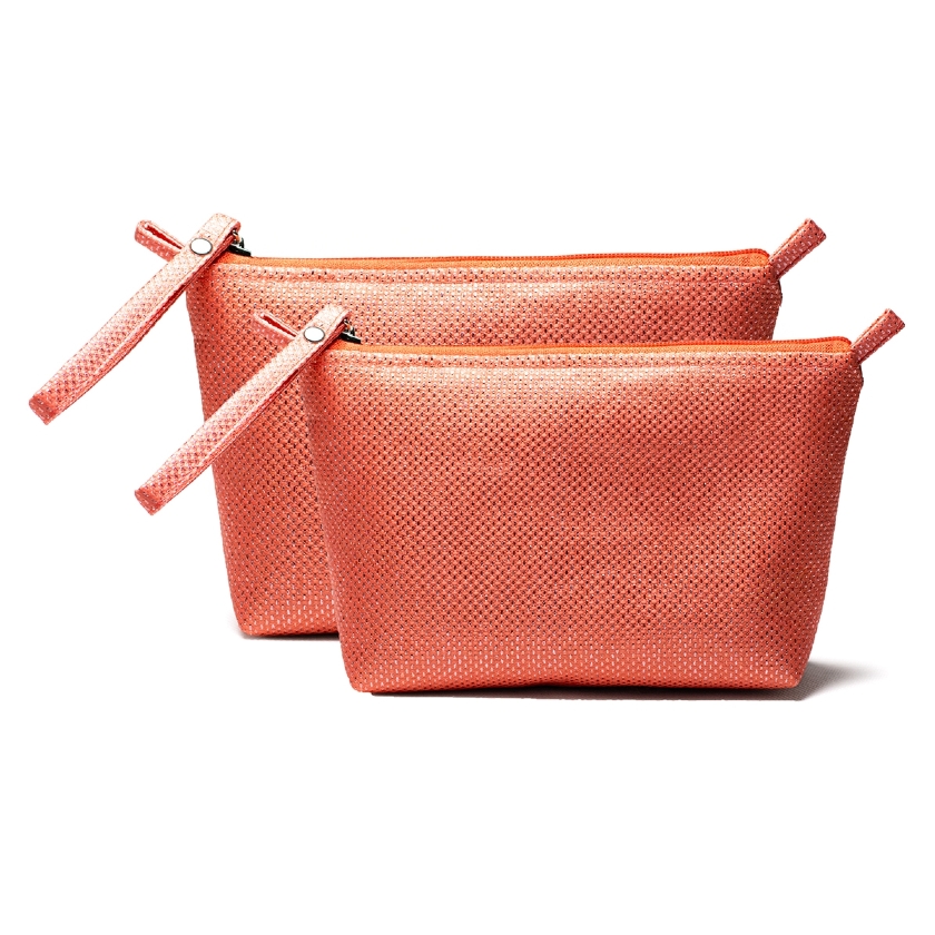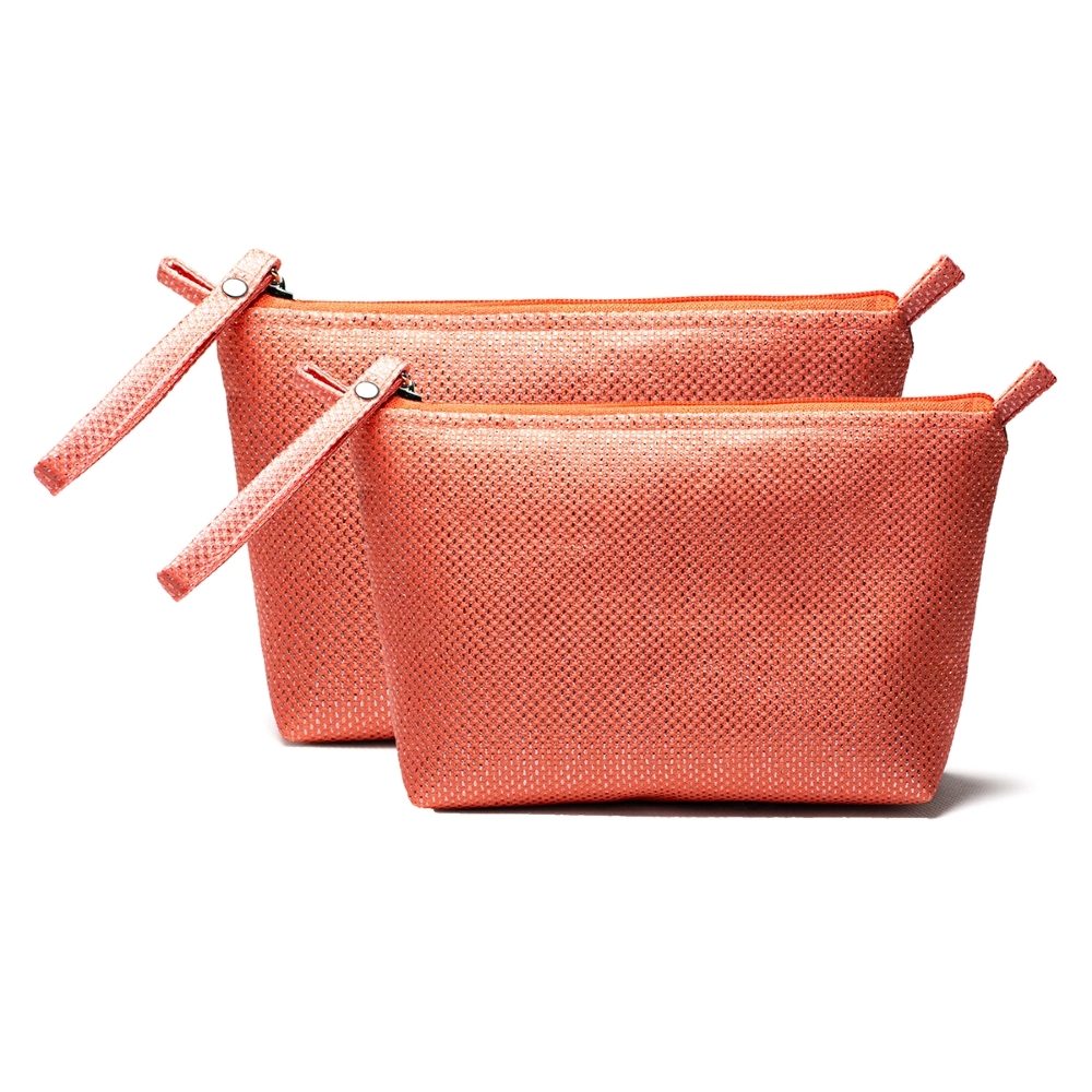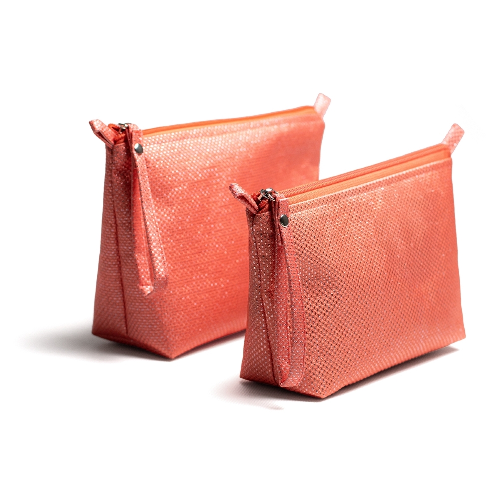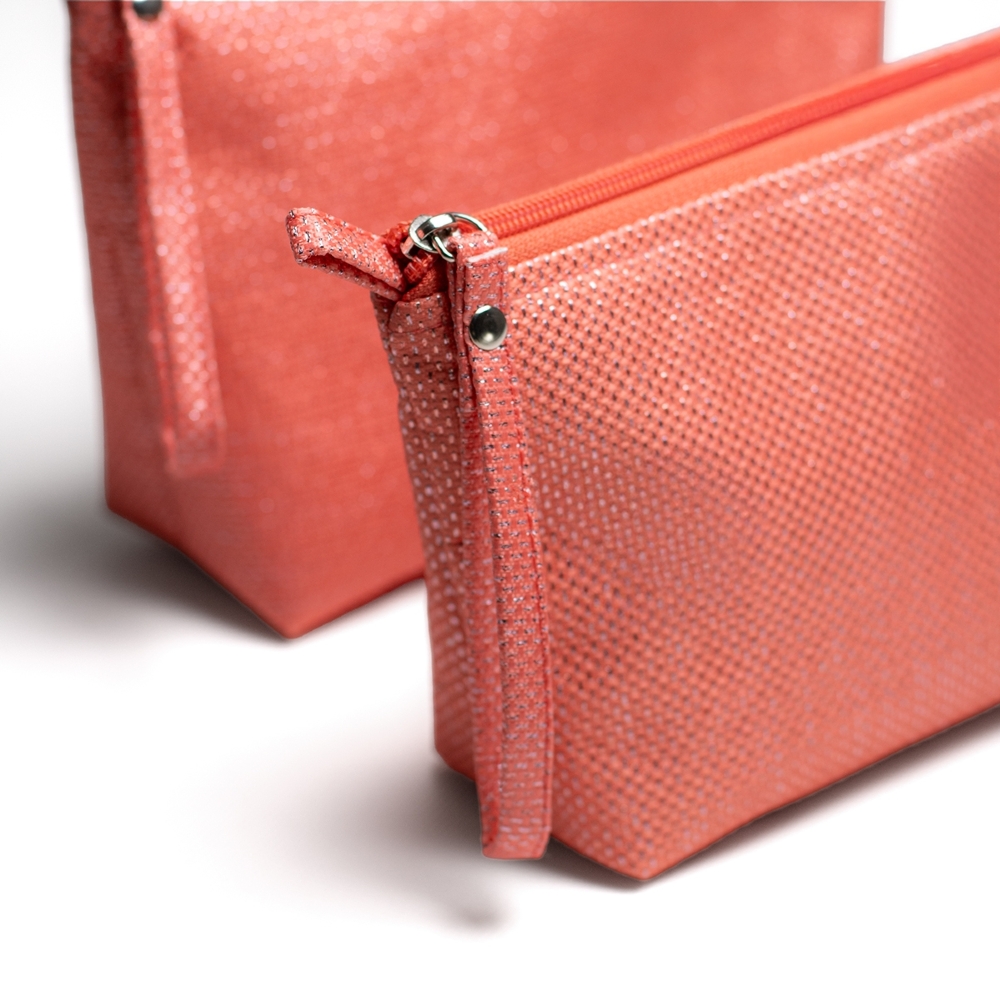 As Necessaires Brilhante, na cor Coral, formam um combo funcional.