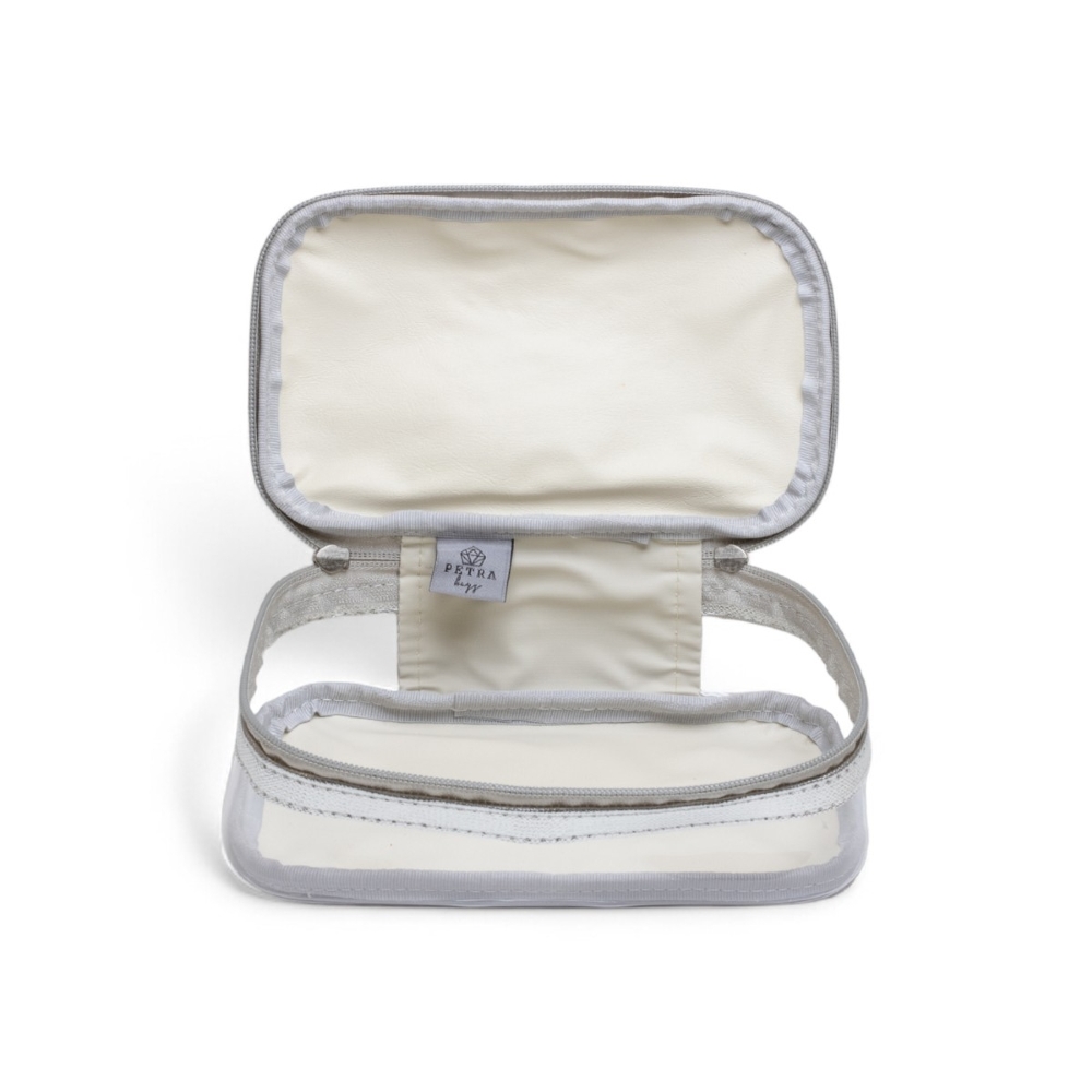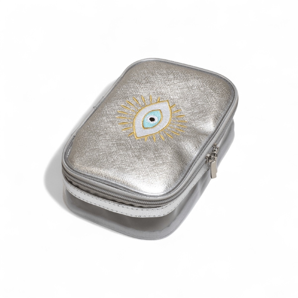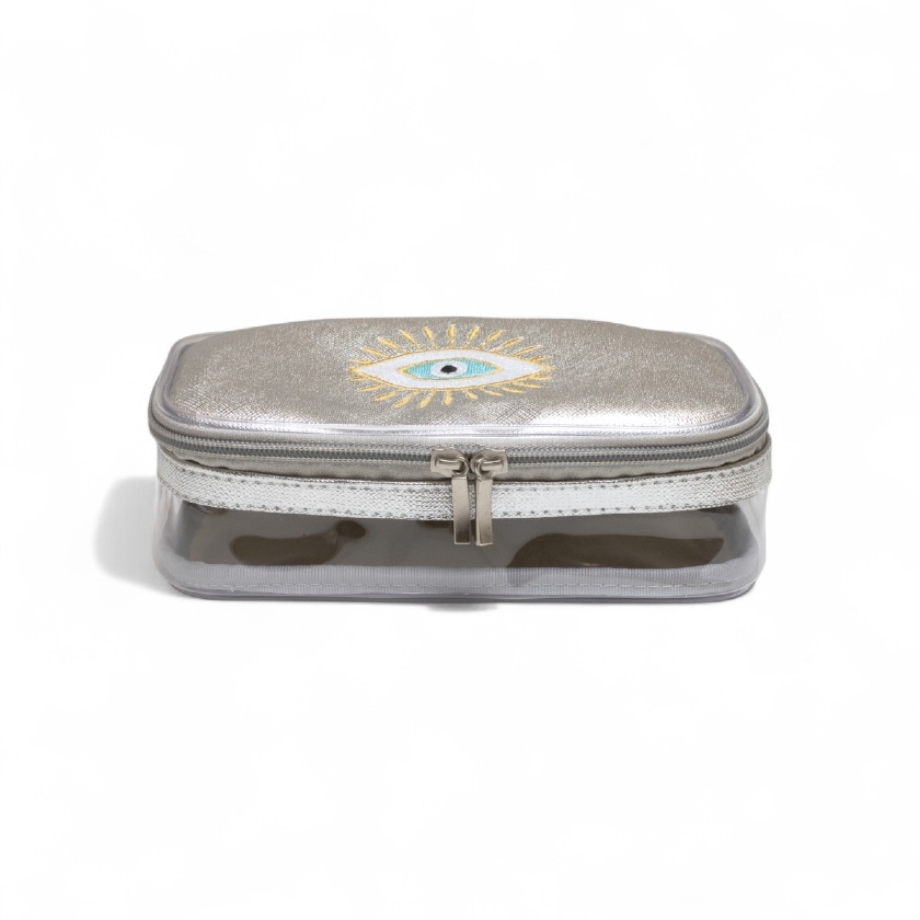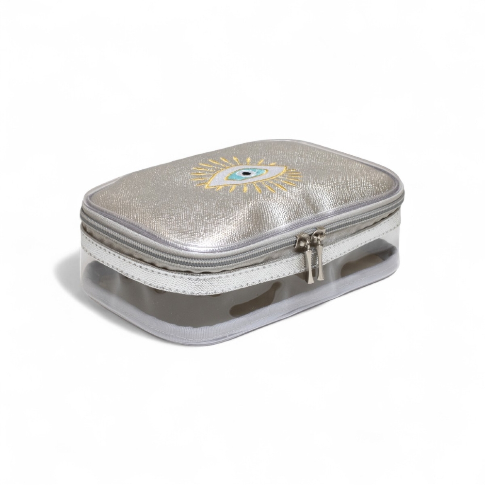 A Necessaire Ônix, na cor Prata Olho Grego, possui tamanho compacto a fim de poder ser guardada em qualquer tipo de bagagem.