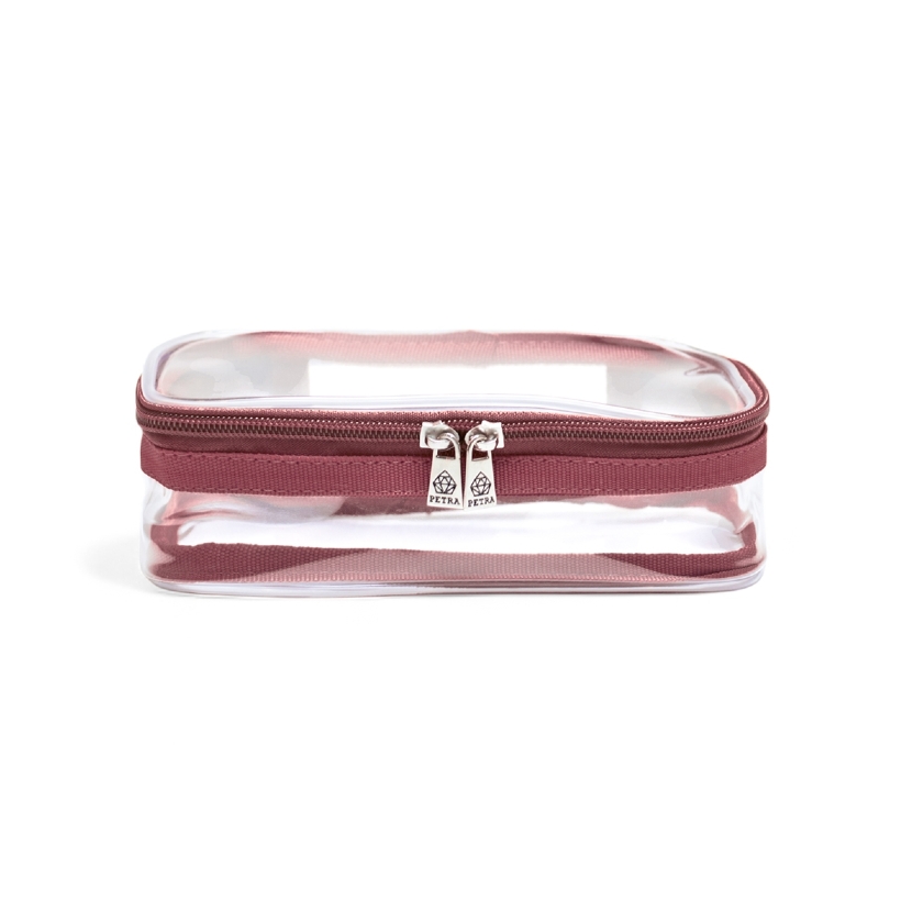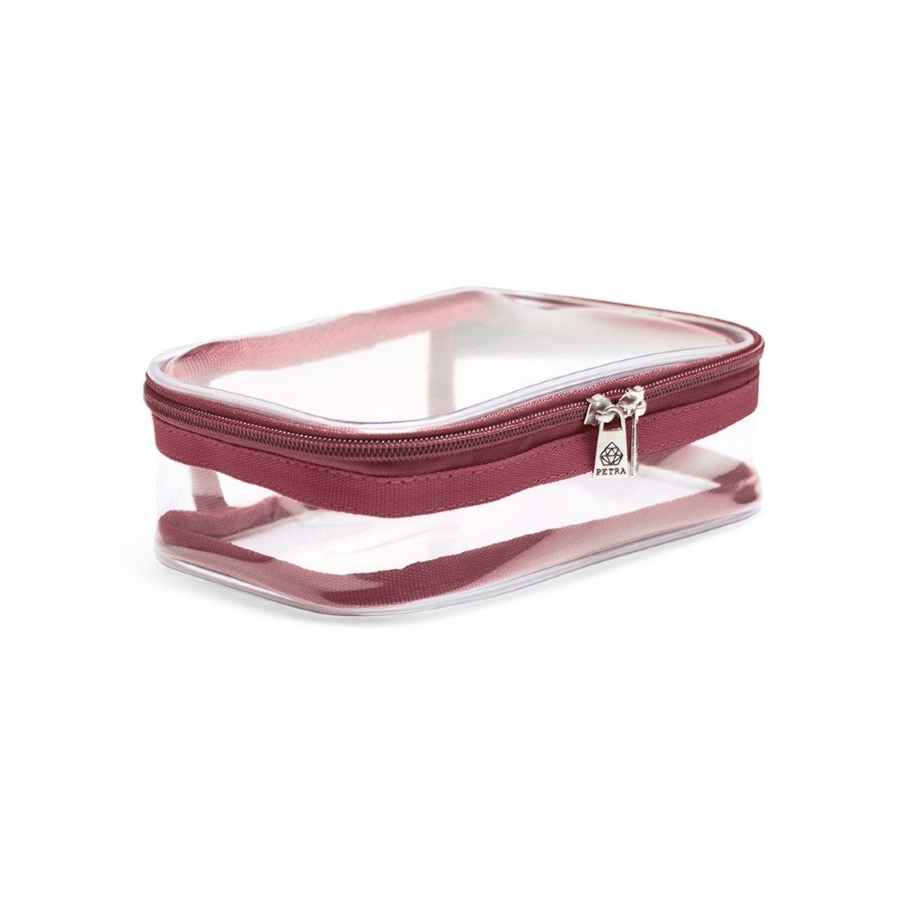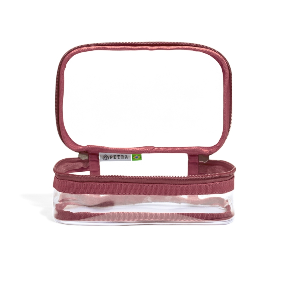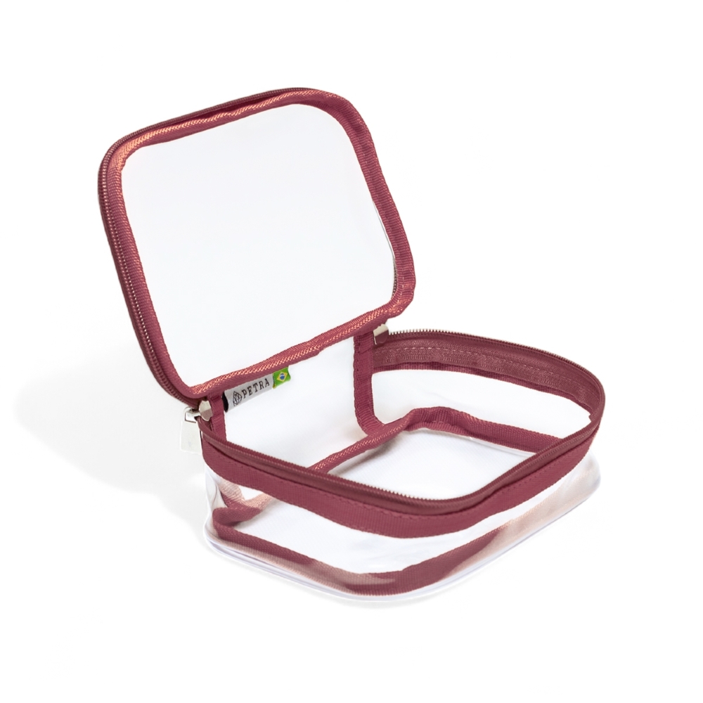 A Necessaire Ônix, na Cor Marsala Translúcido, possui tamanho compacto a fim de poder ser guardada em qualquer tipo de bagagem.